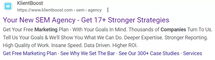 A descrição do anúncio da KlientBoost é altamente eficaz. Ela destaca os benefícios de trabalhar com a empresa e acrescenta um elemento de confiança (por exemplo, “Milhares de empresas usam nossos serviços”).
