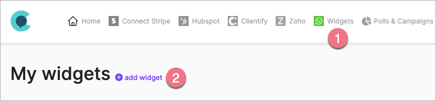 2. Na stronie głównej po zalogowaniu przejdź do zakładki Widgets (1) i kliknij Add widget (2).