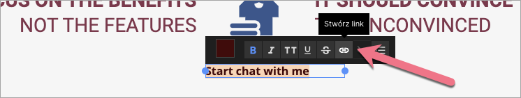 2. W edytorze swojego landing page’a zaznacz tekst, który ma być linkiem do czatu, i kliknij ikonę hiperłącza.