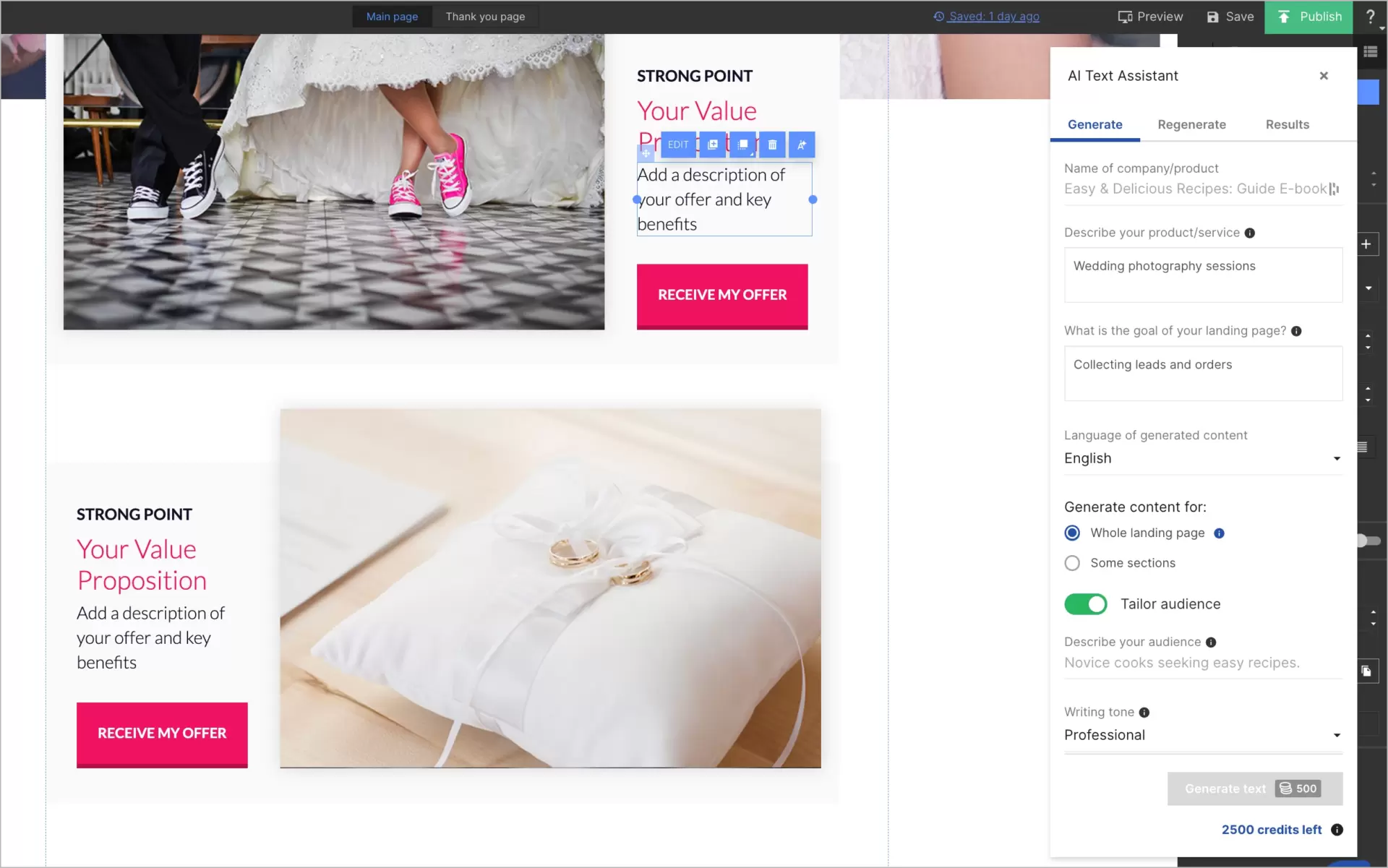 Most users are interested in the first tool I mentioned. So, how does it actually work? AI Assistant creates customized copy that fits your brand’s goals, target market, and writing style. Simply provide information about your company, audience, and tone, and it can generate complete content for everything from headlines to detailed sections of your pages. While some minor edits might be necessary, the results are typically more polished than what is offered by other AI content builders.