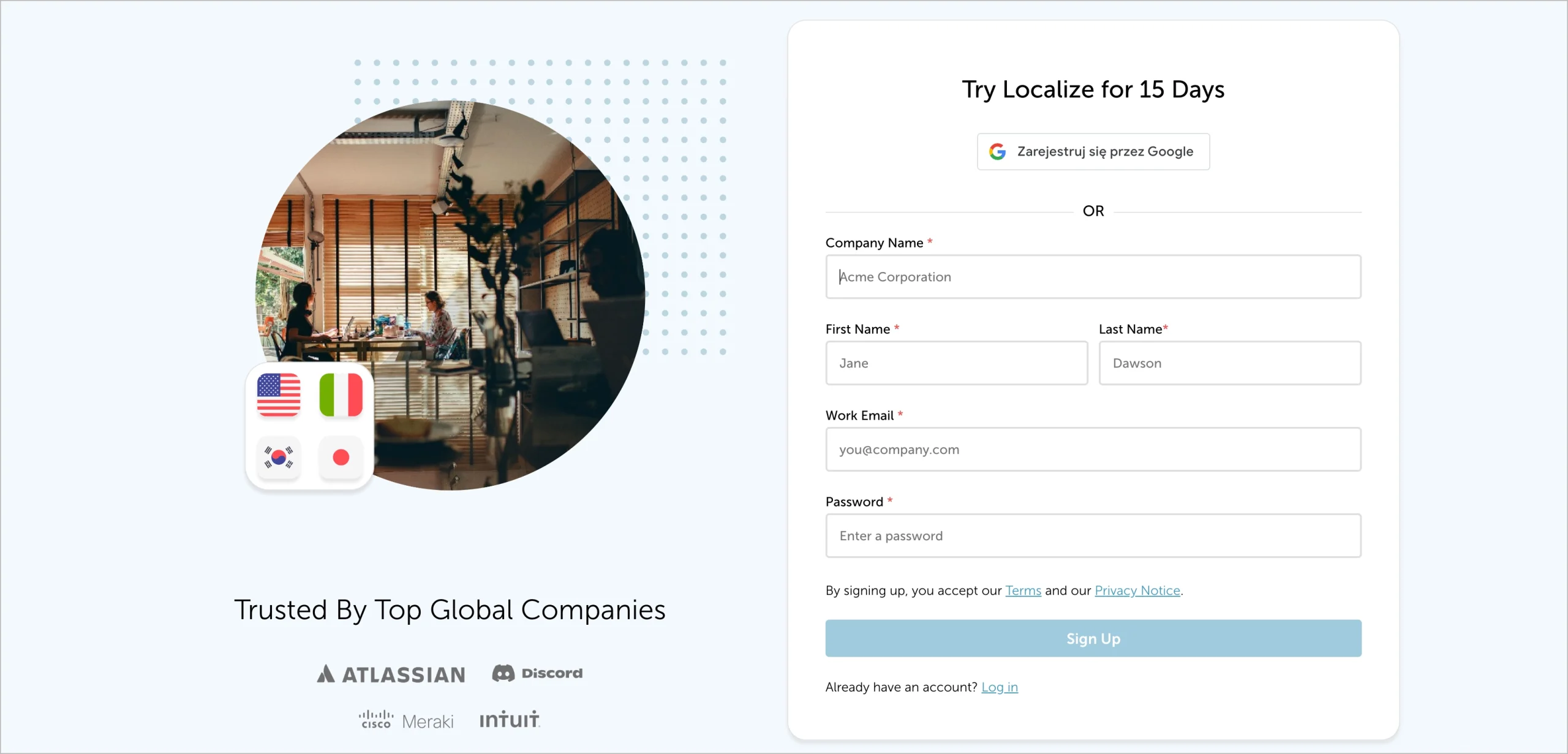 Poniższy przykład byłby idealny, gdyby obraz był ściśle związany z typem firmy. Localize oferuje zautomatyzowane rozwiązanie tłumaczeniowe i nie jest jasne, w jaki sposób obraz na ich landing page’u rejestracji odpowiada DNA firmy. Niemniej, jest on dobrze umiejscowiony i nadaje stronie nutkę estetycznego powabu.