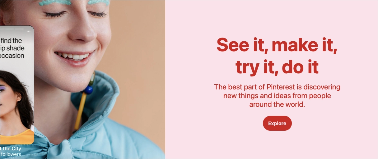 Finally, Pinterest’s copywriting fosters a sense of community and discovery. “The best part of Pinterest is discovering new things and ideas from people around the world,” highlights the global and communal aspect of the platform. It’s not just a tool for individual exploration but a gateway to a world of shared creativity and inspiration. This aspect of the copy appeals to the human desire for connection and learning, making it an effective tool in persuading users to sign up and become part of the Pinterest community.