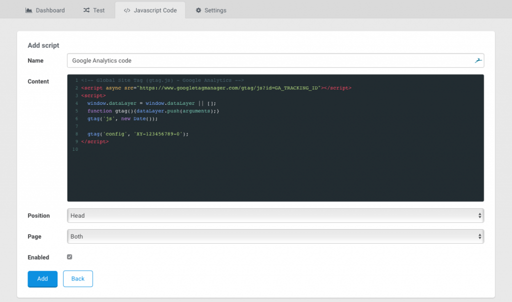- Enabled – uncheck this box if you want to temporarily disable your custom javascript