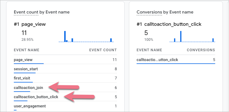 6. From now, your Google Analytics 4 will be capable of tracking two button-click events. You will see the first data in GA4 right away in Reports > Realtime > Event count.
