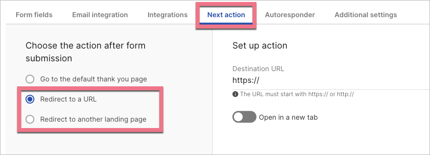 3. Choose Redirect to a URL or Redirect to another landing page. Paste the external page URL or choose your target landing page.