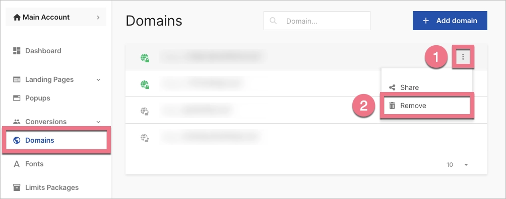 1. Log in to your Landing account, go to the Domains tab, and on the list, find the domain that you want to delete. Click on More (1) (three dots icon) and select Remove (2).