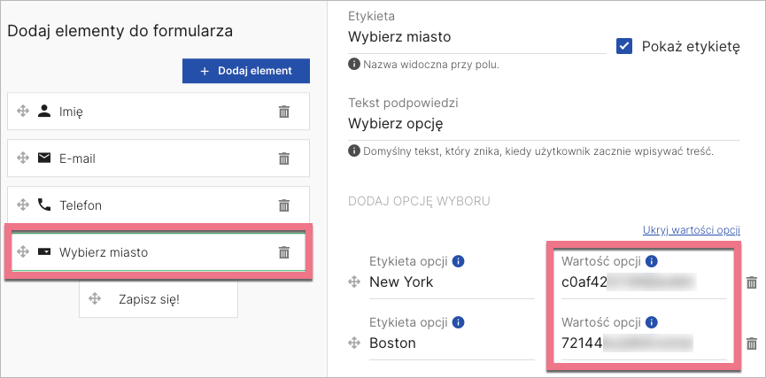 WAŻNE: Jeżeli w formularzu chcesz użyć pola z listą rozwijaną, musisz nadać opcjom wartości równe identyfikatorom elementów w danej liście Lookup w Creatio. Na przykład: jeśli chcesz utworzyć listę rozwijaną z miastami, musisz podać identyfikatory z listy City.