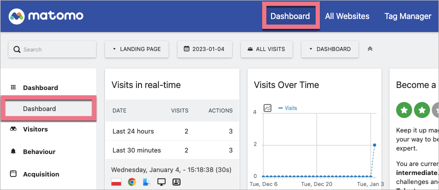 Kod od razu zacznie zbierać dane. Zobaczysz je w Matomo w zakładce Dashboard.