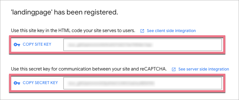 4. Zostaną wygenerowane Site key oraz Secret key, które należy skopiować i wkleić w ustawieniach formularza.