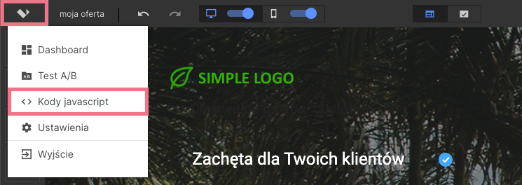Do zakładki kody JavaScript możesz przejść także z poziomu edytora wybranego landing page’a.