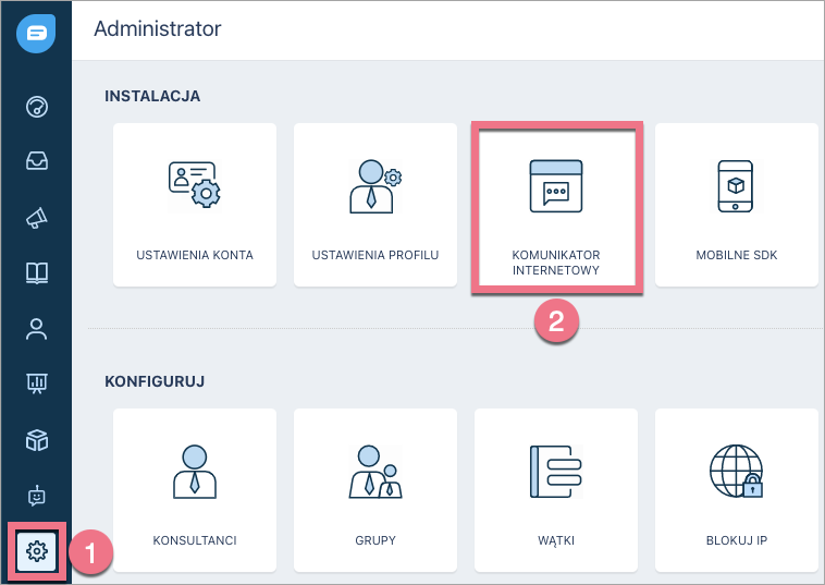 2. Przejdź do zakładki Administrator (1), a następnie wybierz Komunikator internetowy (2).