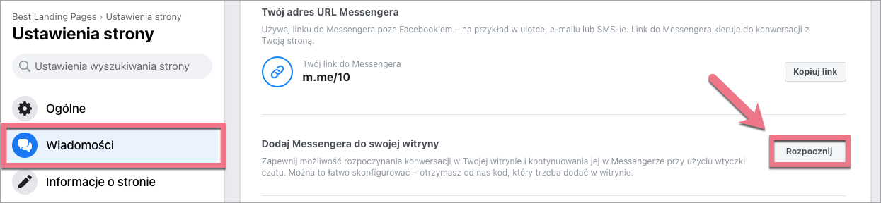 2. Przejdź do zakładki Wiadomości i następnie kliknij Rozpocznij w Dodaj Messengera do swojej witryny.