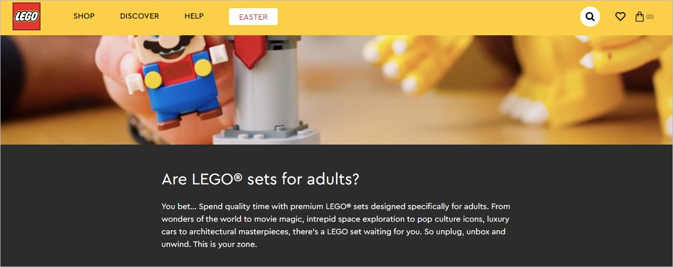 Reklamy LEGO skierowane do dzieci stawiają na kreatywność i zabawę, a te dla dorosłych odwołują się do nostalgii, złożoności i kolekcjonerskiego designu. Nawet doświadczenie na stronie internetowej różni się w zależności od wieku – rodzice łatwo znajdą coś dla dzieci, a bardziej zaawansowani fani budowania mogą odkrywać zestawy z wyższej półki.