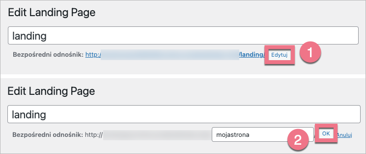 W nowym oknie pojawi się bezpośredni odnośnik. Kliknij Edytuj (1), następnie wpisz nowy adres i kliknij OK (2). Zapisz, klikając Aktualizuj.