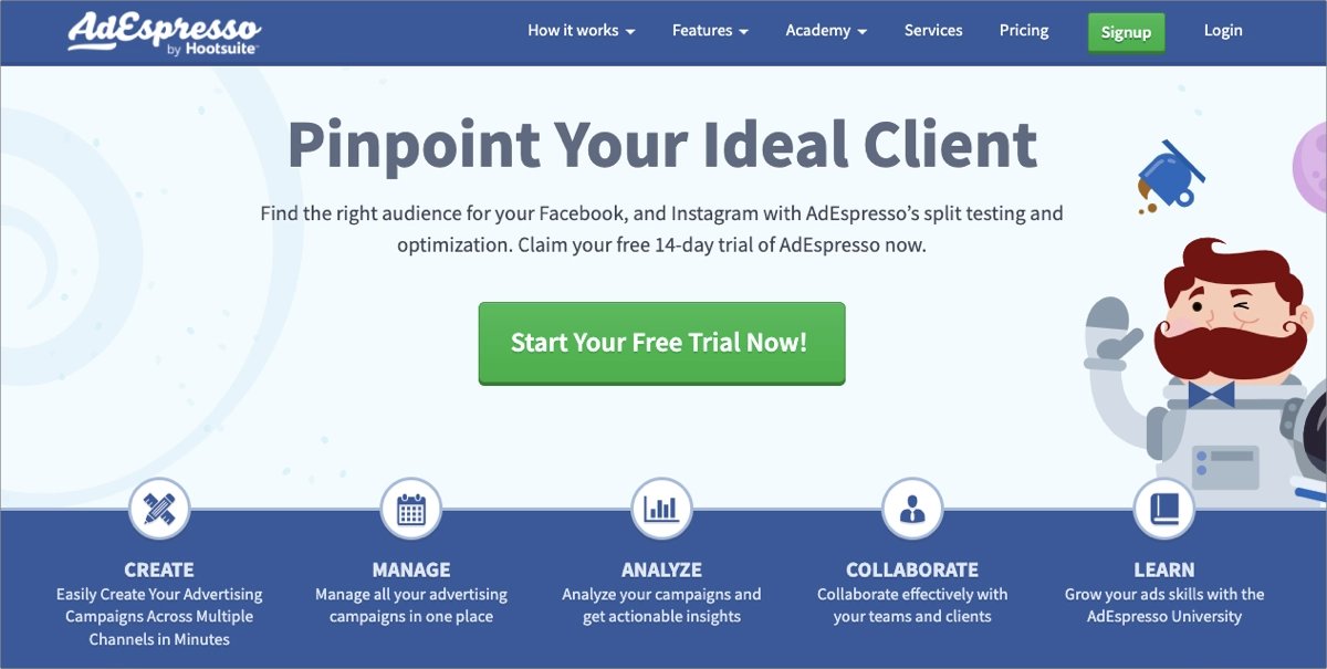 AdEspresso by Hootsuite to przyjazna dla użytkownika platforma do tworzenia i zarządzania kampaniami PPC na wielu platformach, w tym Google Ads i Facebook Ads. Upraszcza tworzenie reklam za pomocą szablonów i oferuje zaawansowane funkcje: testowanie podzielone, targetowanie na odbiorców i szczegółowe analizy. AdEspresso oferuje również przydatne informacje i zalecenia dotyczące optymalizacji, ułatwiając firmom maksymalizację wydajności reklam i zwrotu z inwestycji, jednocześnie oszczędzając czas na zarządzaniu kampaniami.