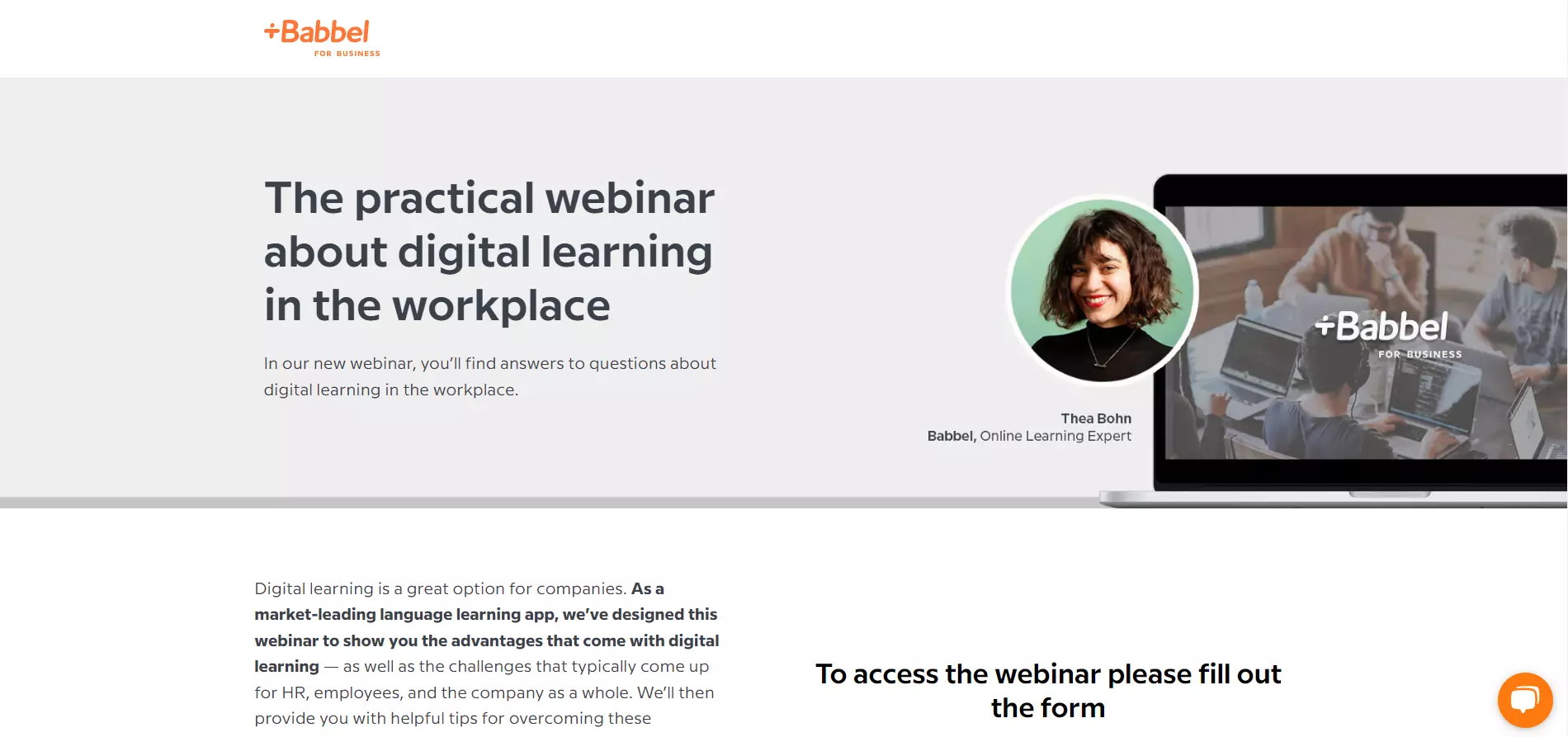 Aby odróżnić nagłówek oraz krótki opis od webinaru, Babbel wykorzystuje na stronie dwukolorowy design.
