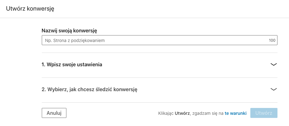 W kolejnym kroku tworzenia kampanii marketingowej wybierz opcję Utwórz nową konwersję, by przejść na stronę z ustawieniami, gdzie podasz szczegóły na temat parametru, który chcesz mierzyć.