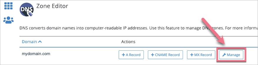 3. Znajdź swoją domenę i wybierz Manage. Zobaczysz listę rekordów DNS.