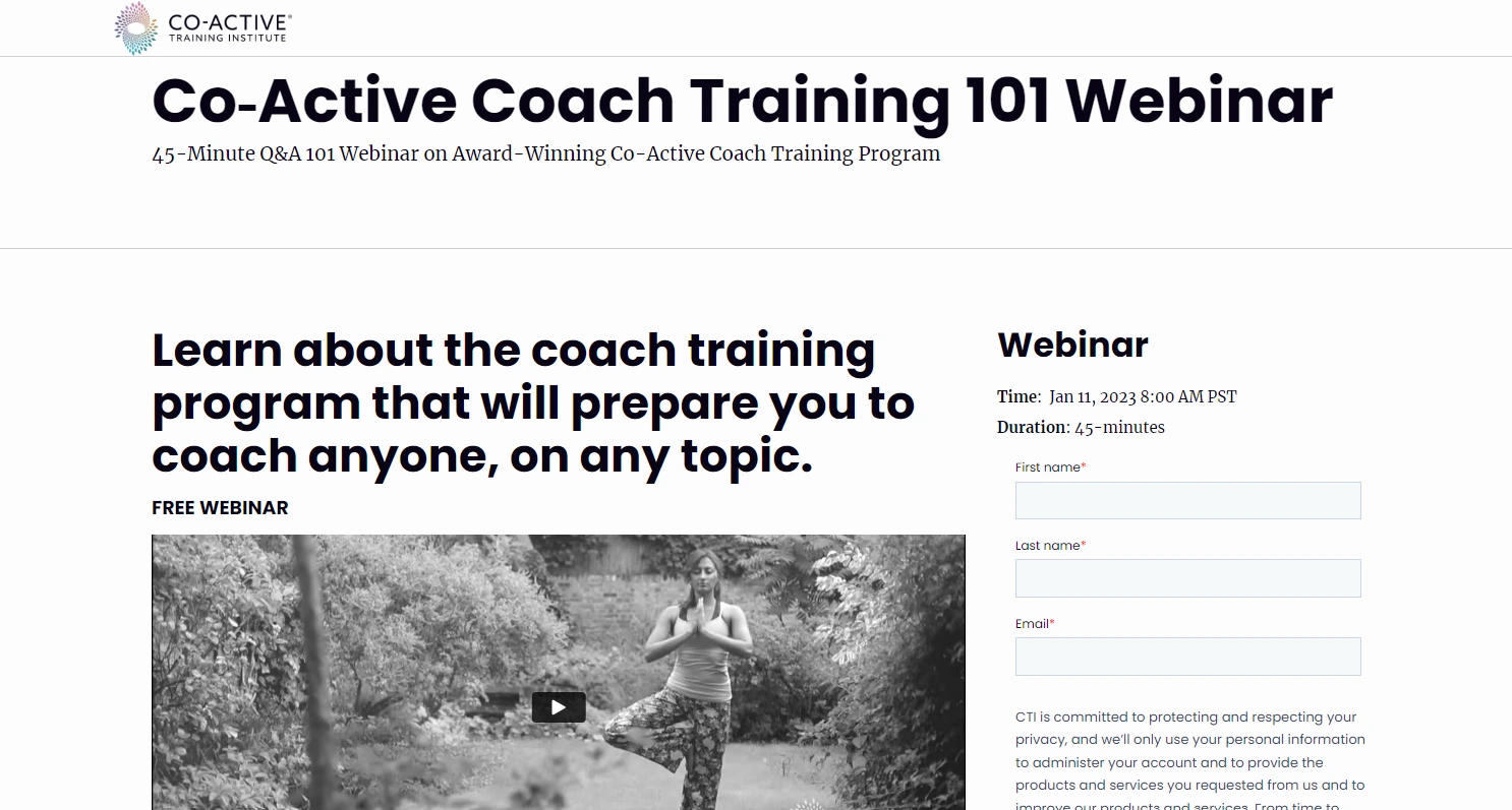 A página inicial do instituto de treinamento coativo é concisa e inclui um depoimento e um selo de confiança. No entanto, a página poderia ser aprimorada com a atualização do design para ser mais moderna.