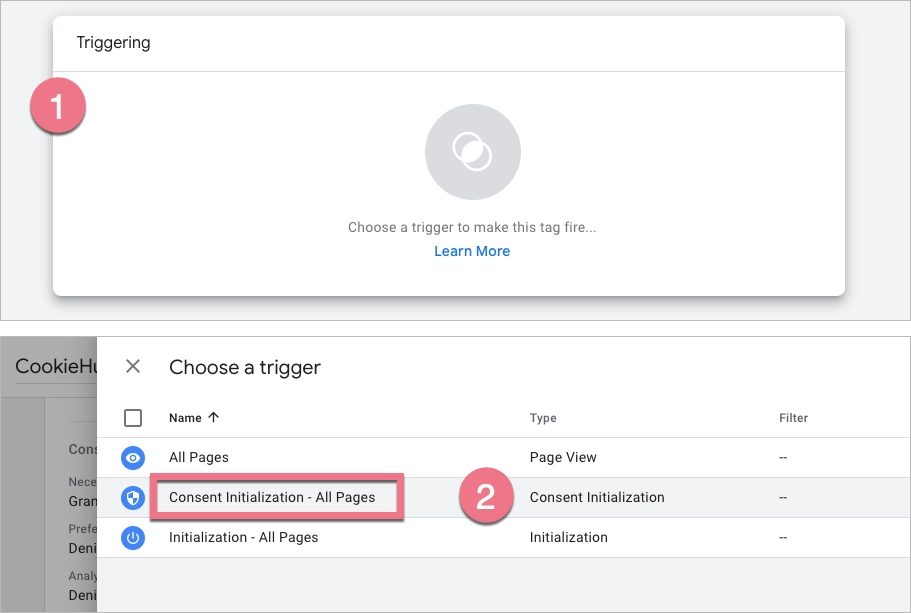 6. Below, click the Triggering (1) area to select the trigger. Select Consent Initialization – All Pages (2) from the list.