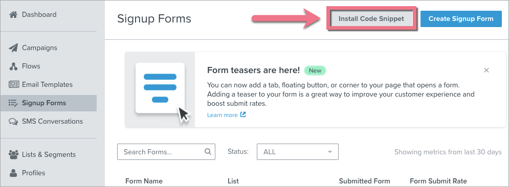 - to implement Klaviyo pop-ups and sign-up forms on your landing page using a JavaScript code, or