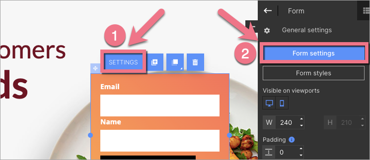 2. Click on the form and enter its Settings from the context menu (1) or toolbar (2).