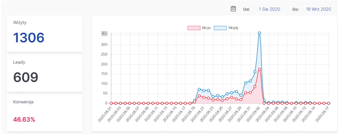 In this particular case, over 600 leads were gathered (from 1300 visits), and 300 people have taken part in the webinar. This means that the overall leads efficiency equaled to almost 50%.