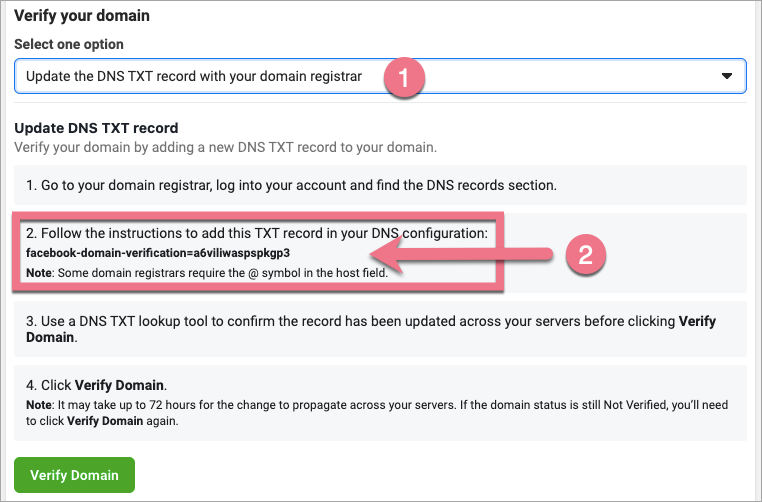 1. Select the verification option. Choose Update the DNS TXT record with your domain registrar (1). Then, copy the record (2).
