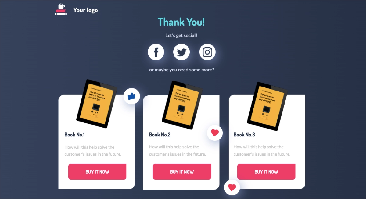 hoose the E-book 2 – Upsell Page template from Landingi to create a well-performing Thank You page and encourage users to share their experience on social media channels and engage further with other offers.