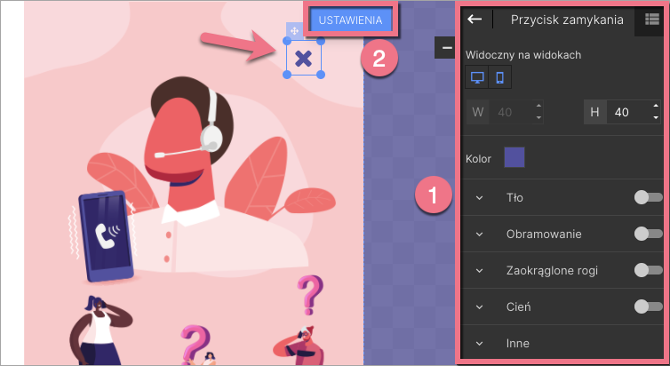 5. Przycisk zamykania (krzyżyk) jest stałym elementem pop-upu – możesz zmienić jego położenie, wielkość, kolor oraz ikonę. Kliknij przycisk, a wyświetli się jego menu podręczne (1) z opcjami edycji. Jeśli chcesz zmienić ikonę przycisku, kliknij Ustawienia (2).