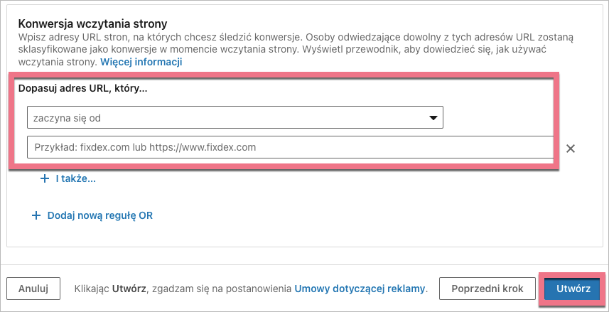6. W sekcji Konwersja wczytania strony wpisz adres URL landing page’a, na którym chcesz śledzić konwersje. Następnie kliknij Utwórz.