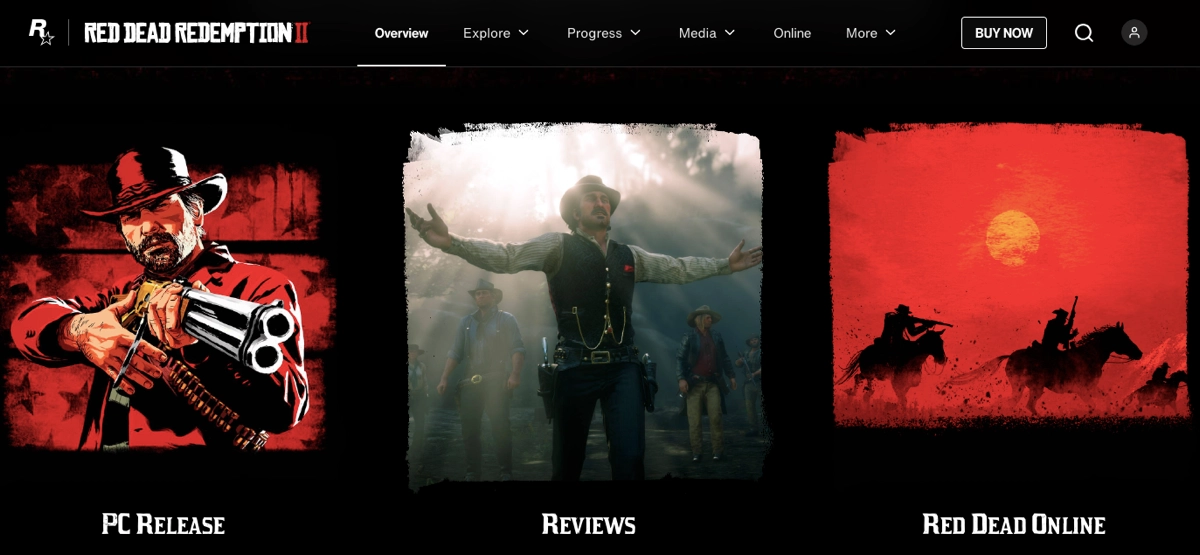 One of the best game landing page examples is the page of the Red Dead Redemption 2 game by Rockstar Games. Their page excels in presenting the game’s world in a compelling way. Its design immerses visitors in the game’s atmosphere, with captivating visuals showcasing its environment and characters.